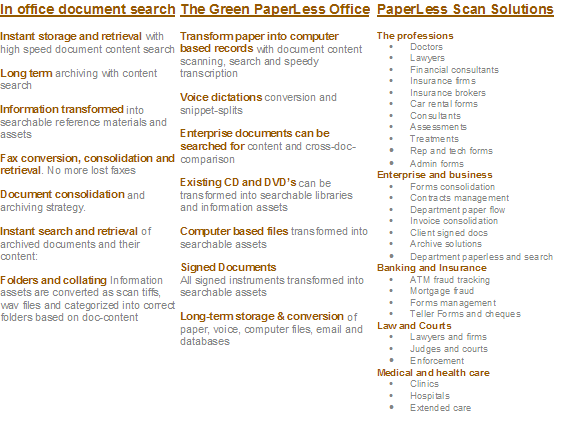 Anywhere paper archives can be converted to digital tiff format and stored and searched for quick access. Ideal for old content that contains value such as legal decisions, mining survey reports, diagnostic assessments, transactions, annual reports,